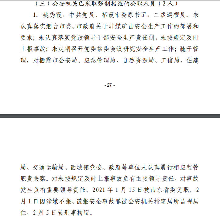 同时,山东五彩龙投资有限公司法定代表人贾巧遇和时任栖霞市委书记姚秀霞,市委副书记、市长朱涛,因负有迟报瞒报事故责任,目前由公安机关立案侦查。