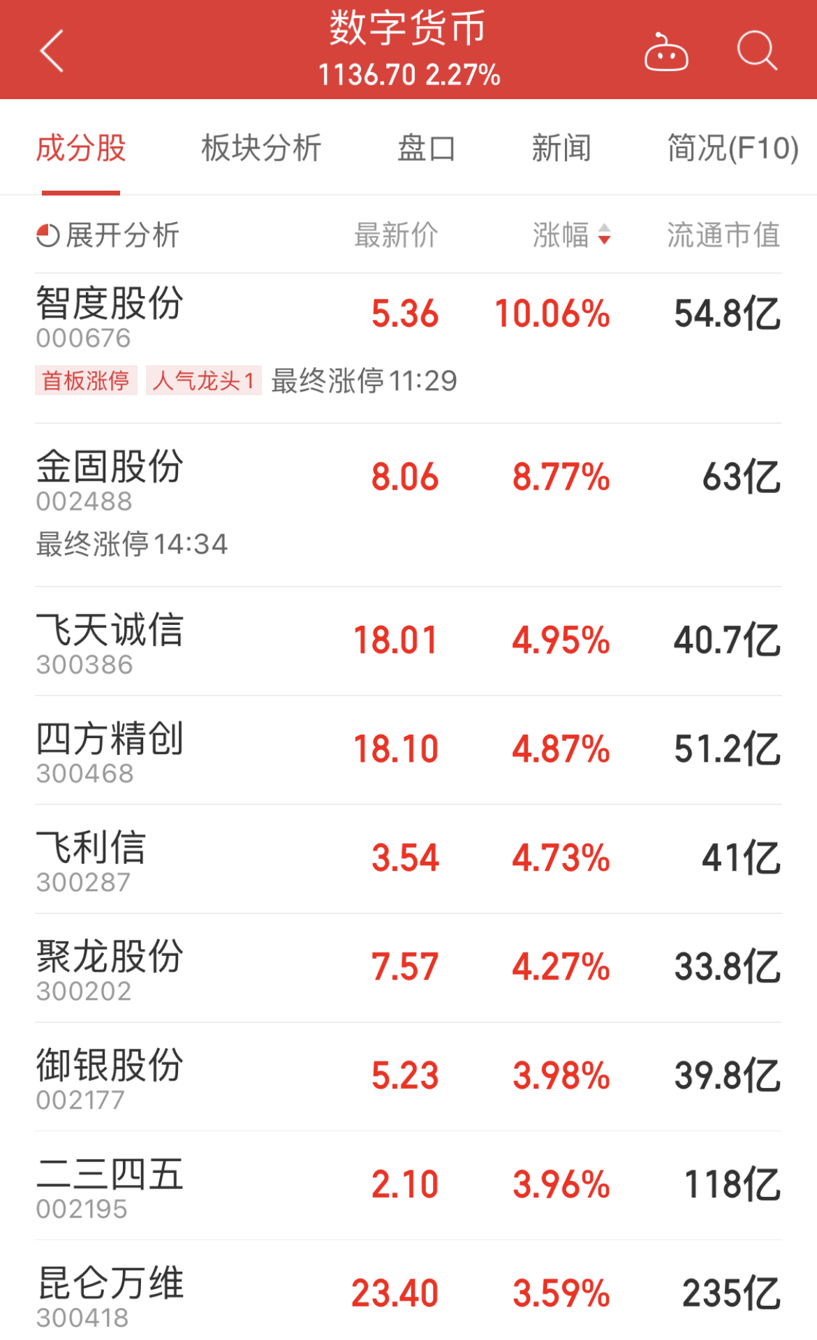 A股市场上,经过昨日的回调,数字货币板块今日走高,截至收盘,同花顺数字货币板块涨2.27%,板块内智度股份涨停,金固股份涨超8%,飞天诚信涨近5%。