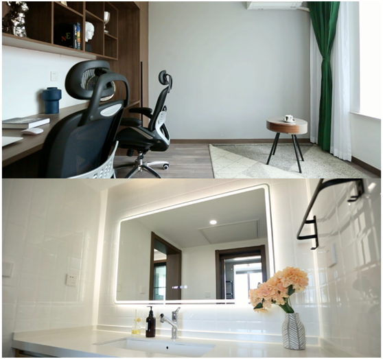 进门处采用回字形环绕动线,将访客、家务区与休息、私密区做了明显的分割。同时又用动线将睡眠区和书房区,在空间上彻底分开,每个区域设置卫生间,将相对的独立性大大提升。