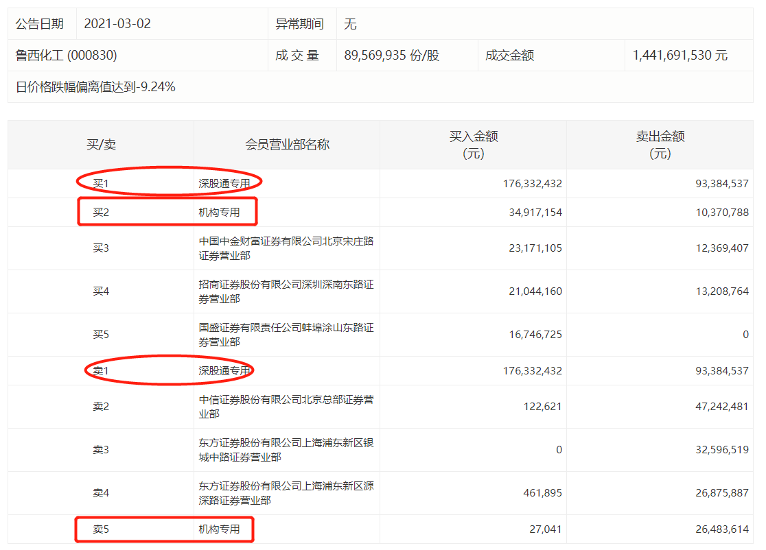 3月2日,鲁西化工跌停,收报15.59元,换手率6.12%,振幅9.30%,成交额14.42亿元。盘后数据显示,共2个机构席位出现在榜单上,一机构净买入2454万元,另一机构卖出2648万元,合计净卖出191.02万元,占该股今日总成交额的0.13%。深股通占据了买一、卖一的位置,净买入8294.79万元,占当日成交总额的5.75%。