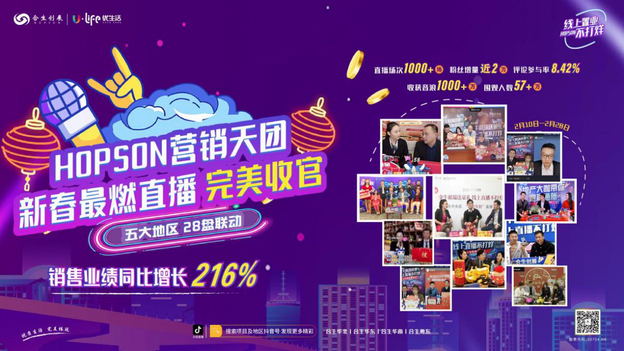 据悉,2.10~2.28日期间,合生创展5大地区28盘联动,开展了“金牛献瑞送豪礼、线上直播不打烊”活动,真正做到每天有直播、场场有互动。在五大区域累计近60万直播观看人数的助推下,合生创展2月销售业绩同比高增216%。