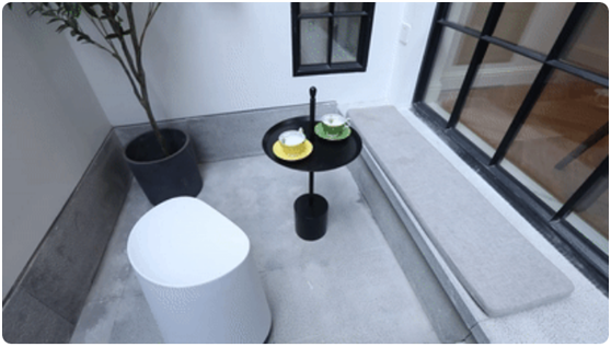 将原先天井的卫生间搬进室内,占地3㎡。确保洗脸区、淋浴区、马桶区三大功能,干湿分离。