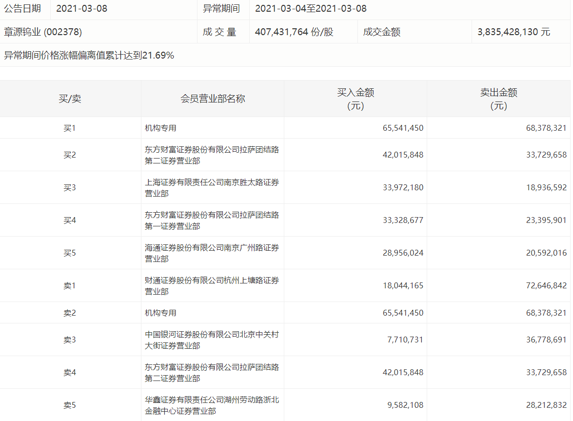 章源钨业今日涨停,盘后数据显示,一机构买入6554万元并卖出6838万元,东方财富拉萨团结路第二证券营业部买入4202万元,财通证券杭州上塘路证券营业部卖出7265万元。
