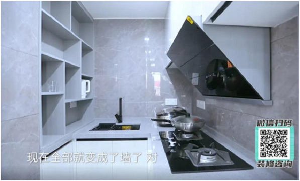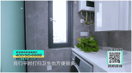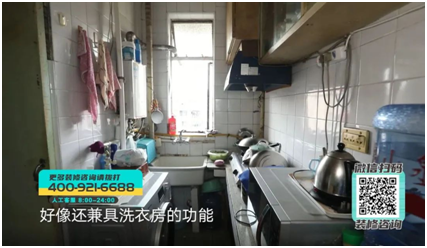 在洗衣机和橱柜的“夹击”下,整个厨房仅能容纳一人通行,就连转身也非常困难,用业主的话说:现在的厨房就是个鸡肋。