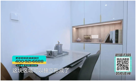 餐边柜中间的镂空隔板内还装有灯带,散发着阵阵暖意。