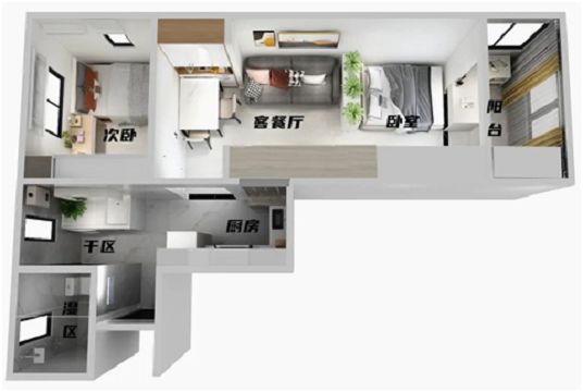 设计师将次卧与主卧间的非承重墙向次卧挪移,将主卧分隔为客餐厅区和卧室区。