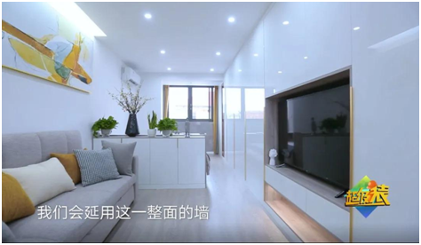 为了提高全屋收纳量,设计师将右侧墙面全部规划为储物柜,从客厅延伸至阳台,让40㎡的小户型拥有80㎡的储物空间。