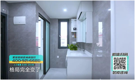 原本厨房的空间被改造成卫生间干区,集合洗手台及洗衣机柜,实现了干湿分离;联动移门从视觉上提升了卫生间面积,还便于日常清洁。