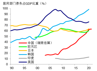 居民整体债务增长有所放缓,但其占GDP的比重明显上升。中国居民债务在2016-17年快速扩张,在那之后增长已有所放缓,主要因为随着房地产销售走弱,房贷增速回落。2020年,中国居民债务增长了14.2%(2018年增速为18.2%,2019年为15.5%),年末余额为63.2万亿元,相当于GDP的62%。其中,房贷占居民债务余额的55%,消费贷款(包括信用卡贷款、车贷等)占24%,个体工商户经营贷款占22%。后者在去年增长了20%,其中部分可能被用来购房,而消费贷款增速则降至8.6%。居民债务占GDP的比重从2015年的39%和2019年的56%快速上升至2020年的62%。虽然占比低于2019年美国的75%、日本的61%和韩国的95%,但目前中国居民债务占可支配收入的比重已与部分发达国家相当,我们估算2020年该比重为108%,较2015年的72%大幅上升。