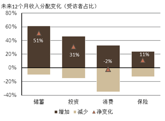 受访者对增加消费的态度偏谨慎。平均而言,受访者将收入中的34.6%用于消费,21.4%用于偿还债务,15.5%用于缴纳税费,28.5%用于储蓄和投资。对于未来12个月的预期,从占比的净变化来看(计划增加与计划减少的受访者占比之差),计划将更多收入用于储蓄的受访者净占比为51%,用于投资的受访者净占比为31%,用于保险的受访者净占比11%,但计划将更多收入用于消费的受访者占比(33%)要低于计划减少消费的受访者(35%)。上述结果和去年中国消费者问卷调查大致相似,不过消费意愿有所减弱。具体来看,更多来自三四线城市、45岁及以上年龄组和中低收入群体中的受访者计划减少消费在收入分配中的比重,这可能反映出这部分群体的收入受到疫情的影响较大、对未来的担忧依然存在。