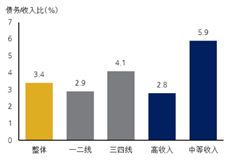 居民杠杆率的上升速度可能趋缓。我们预计今年中国居民整体债务增速为12.2%,比2020年下降2个百分点。虽然房贷之外的消费贷款增速可能会小幅反弹,但鉴于对房地产相关信贷的监管可能会进一步收紧、房地产销售可能走弱,我们预计房贷及经营类贷款增速可能会分别放缓至11%和14%左右。再加上今年名义GDP和居民收入有望大幅反弹,我们预计今年居民债务占GDP比重可能仅增长1个百分点至63%、居民债务占可支配收入的比重基本企稳。朝前看,虽然居民债务可能会进一步增长,考虑到对房地产相关信贷的监管收紧、消费信贷渗透率已经不低,以及三四线城市和中低收入群体的偿债负担相对较高,未来居民杠杆的上行空间应比较有限。