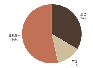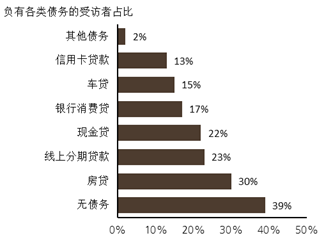 居民债务渗透率为61%、水平已经不低。问卷调查显示,61%的受访者身背债务,其中30%有房贷,22-23%负有线上分期贷款或现金贷,15-17%负有车贷或信用卡贷款。这与我们去年的中国消费问卷调查的结果基本一致。此外,本次问卷调查显示,来自一二线城市、青年和中年群体(25-44岁)以及中高收入群体中负有债务的受访者占比更高。同时,75%的受访者表示曾借过线上分期贷款。以全球标准来看,中国居民的债务渗透率并不算低,瑞银美国消费金融问卷调查显示美国居民债务渗透率为71%。