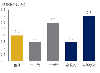 瑞银银行业分析师预计今年房贷之外的消费信贷增速会从2020年9%的低基数上小幅反弹至13%。考虑到对房地产相关信贷的监管可能会进一步收紧、房地产销售可能走弱,我们预计房贷及经营类贷款增速都可能有所放缓。我们预计今年中国居民整体债务增速为12.2%,较2020年放缓2个百分点。朝前看,虽然居民债务可能会进一步增长,但鉴于对房地产相关信贷的监管收紧、消费信贷渗透率已经不低,且三四线城市和中低收入群体偿债负担较高,我们认为居民债务的上行空间应相对有限。
