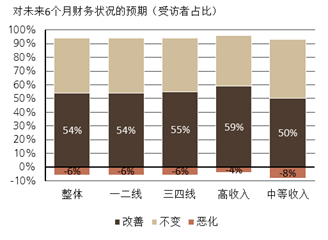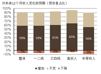 受访者对未来收入和财务状况的预期有所改善。59%的受访者预计未来6-12个月收入会有所增加,7%的受访者预计收入会有所下降。平均而言,受访者预计收入会增长4.1%。相比之下,过去12个月只有49%的受访者表示收入有所增加、而17%表示收入有所下降,且平均收入涨幅为2.1%,这表明未来居民收入情况可能会有所改善。与之类似,预计财务状况会有所改善的受访者占比有所提高(预计未来6个月财务状况会有所改善的受访者占比54%;过去6个月财务状况得到改善的收受访者占比38%),而预计财务状况会恶化的受访者占比降低(预计未来6个月财务状况会恶化的受访者占比为6%;过去6个月财务状况恶化的受访者占比为14%)。我们也预计居民收入增长和消费者信心将有所反弹。不过值得注意的是,更多来自三四线城市(19%)和中低收入群体(21%)的受访者表示过去12个月收入有所下降。朝前看,高收入群体的受访者预计未来12个月收入会有所增加的占比更高(65%;中低收入群体中占比为56%),且其对当前的债务状况或者失业的担忧也小于其他群体。
