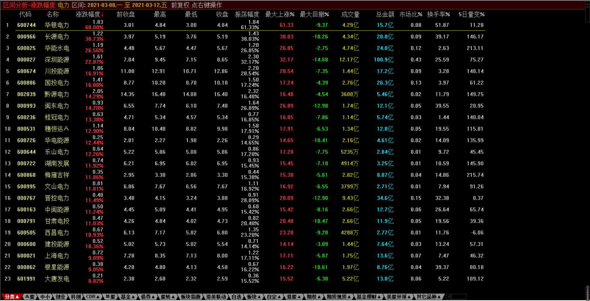 盘面上,电力板块掀涨停潮,周内逆势上扬8.56%,长源电力涨停,南网能源、梅雁吉祥、华银电力此前封板。电力行业涨幅第一的公司为华银电力(60.8%),燃气行业涨幅第一的公司为重庆燃气(6.5%)。