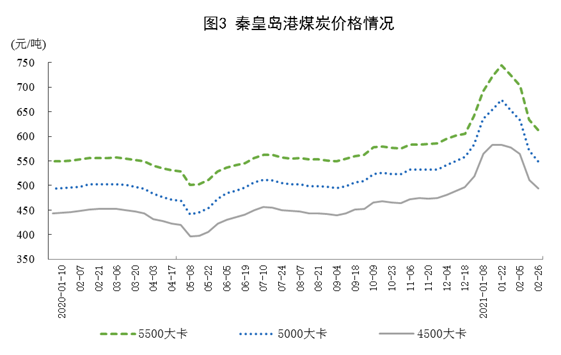 港口煤炭综合交易价格高位回落。2月26日秦皇岛港5500、5000和4500大卡煤炭价格分别为每吨613元、550元和494元,比1月22日最高价分别下降132元、124元和89元。