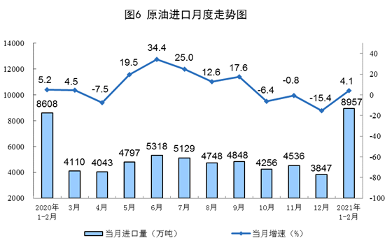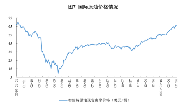 原油进口小幅增长,国际原油价格持续上涨。进口原油8957万吨,同比增长4.1%;国际原油价格持续上涨,2月26日布伦特原油现货离岸价格为65.86美元/桶,比1月4日50.37美元/桶上涨30.8%。