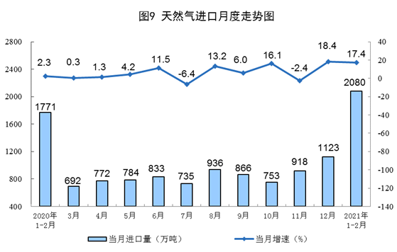 天然气生产同比较快增长,日均环比保持稳定。1—2月份,生产天然气348亿立方米,同比增长13.5%,比2019年1—2月份增长22.5%,两年平均增长10.7%;日均产量5.9亿立方米,比上年12月份减少0.1亿立方米。进口天然气2080万吨,同比增长17.4%。