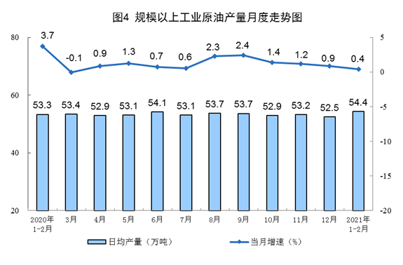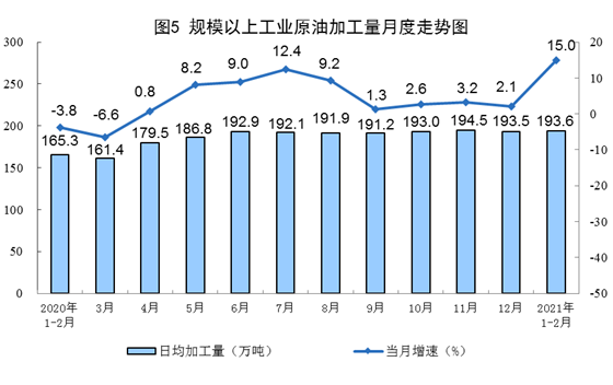 原油生产同比保持稳定增长,日均环比增产。1—2月份,生产原油3208万吨,同比增长0.4%,比2019年1—2月份增长4.1%,两年平均增长2.0%;日均产量54.4万吨,比上年12月份增加1.9万吨。加工原油11424万吨,同比增长15.0%,比2019年1—2月份增长10.6%,两年平均增长5.2%;日均加工193.6万吨,比上年12月份增加0.1万吨。