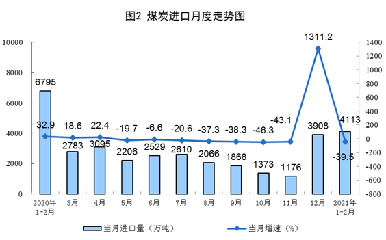 原煤生产同比较快增长,日均环比略有下降。1—2月份,生产原煤6.2亿吨,同比增长25.0%,比2019年1—2月份增长17.1%,两年平均增长8.2%;日均产量1047万吨,比上年12月份减少88万吨。进口煤炭4113万吨,同比下降39.5%。