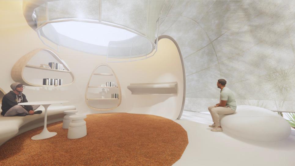 在即将于本月17-21日开幕的2021深圳时尚家居设计周7号馆国际工作环境设计应用展上,Daniel和他的团队成员们构思了一个全新的办公空间——他们以自然界的生物为灵感,将建筑外壳设计成茧形,内部则是一个弧状实体空间。当参观者走进这一空间时,材质、音效和光影的随机变动会让他们收获不同的感官体验。从外部看,这一建筑就像在城市钢铁森林中散发着幽光的生物体,朦胧而静谧,犹如一件艺术品,内部则摆放着沙发桌椅,人们可以在此交谈或独自工作,别有一番天地。