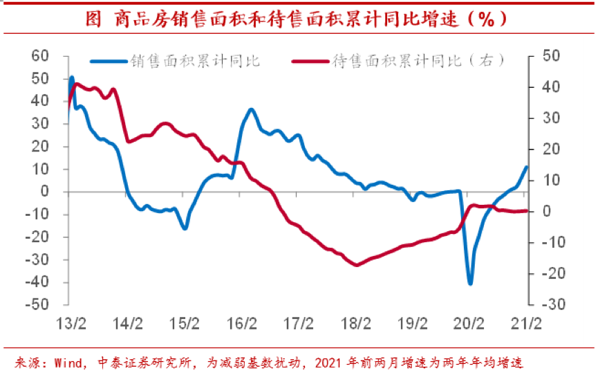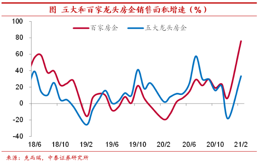 龙头房企销售迎来“开门红”。另一方面,从销售端来看,今年前两个月五大和百家龙头房企销售面积同比增速分别高达33%、76%,即便考虑到2020年同期由于疫情导致的低基数,这一增速依然明显偏高。可以说,今年房地产企业在销售上迎来了“开门红”。前两月全国地产销售面积同比增速也攀升至105%,两年平均增长11%,较2020年底增速基本保持稳定。
