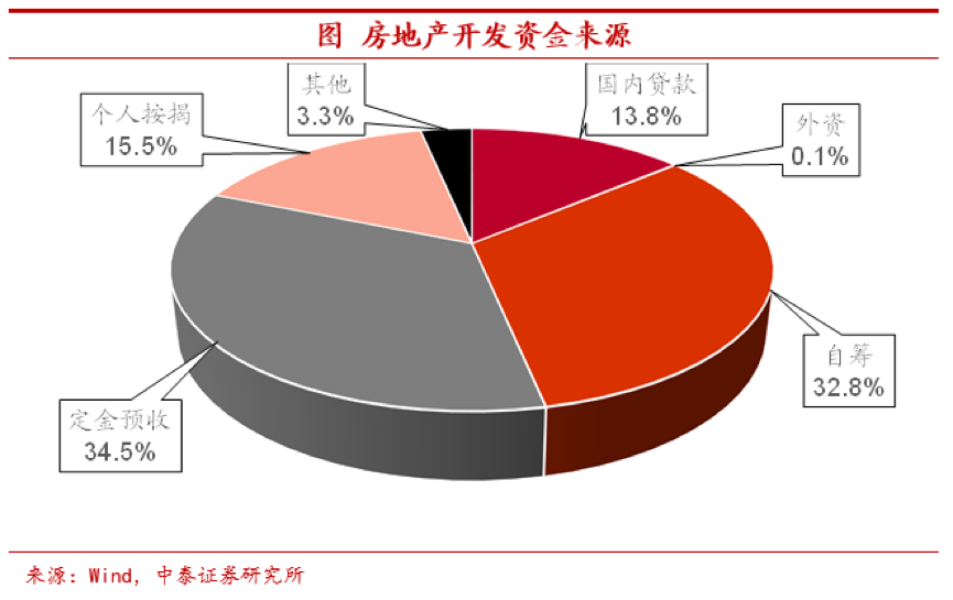 资金依赖销售回款,潜在影响同样不小。房地产企业的开发资金很大程度上依赖于销售回款。从2020年的情况来看,房地产开发资金中有15.5%来自于个人按揭贷款。34.5%来自于定金及预收款,几乎一半的房地产开发资金都和地产销售紧密相关。地产销售增速一旦走低,房企资金压力也将有所上升。