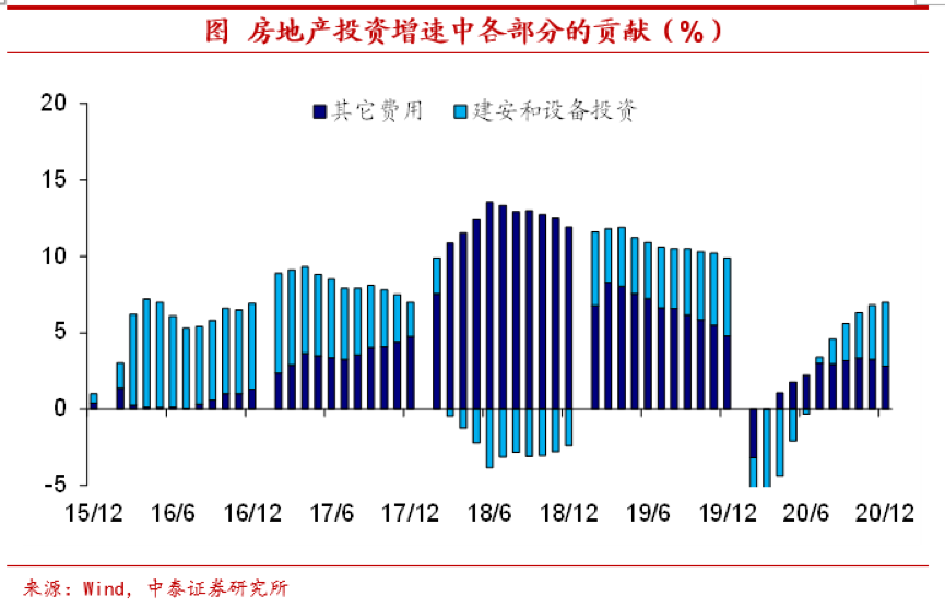 即便去年土地成交价款存在着大幅增长的情况,或将滞后反映在土地购置费上,支撑地产投资中的其它费用部分。但事实上,这部分的增长相对于建安投资而言,对于实体经济并没有很强的拉动作用,也不直接计入GDP之中。