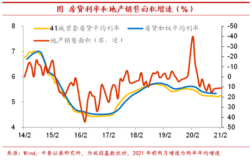 销售一旦放缓,去化压力更大。虽然从狭义的库存销售比来看,地产库存压力并不明显,但这是建立在较快销售增速的基础之上。2021年2月41城首套房贷利率环比上升4BP,已经回到2020年7月的水平,而房贷利率的抬升将会拖累地产销售增速的走低,一旦销售放缓,则地产库存去化压力将进一步加大。