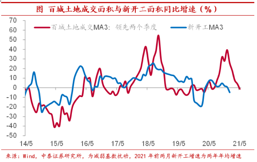 库存较高融资受限,拿地意愿并不积极。在地产库存较高、内外部融资受限的情况下,房地产企业拿地意愿并不积极。从百城土地成交所反映的情况来看,今年前两个月成交面积增速由正转负、显著下滑,而剔除基数影响的全国购置土地面积增速跌幅也有所扩大。这会逐渐传导到开工端,今年前两个月新开工面积同比增长虽高达64%,但两年年均增速仅有-4.8%,明显低于2020年底的水平。