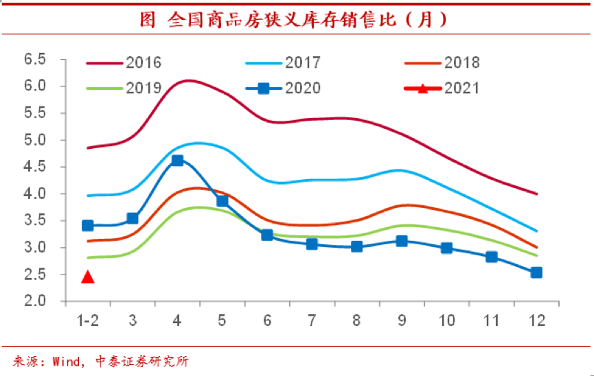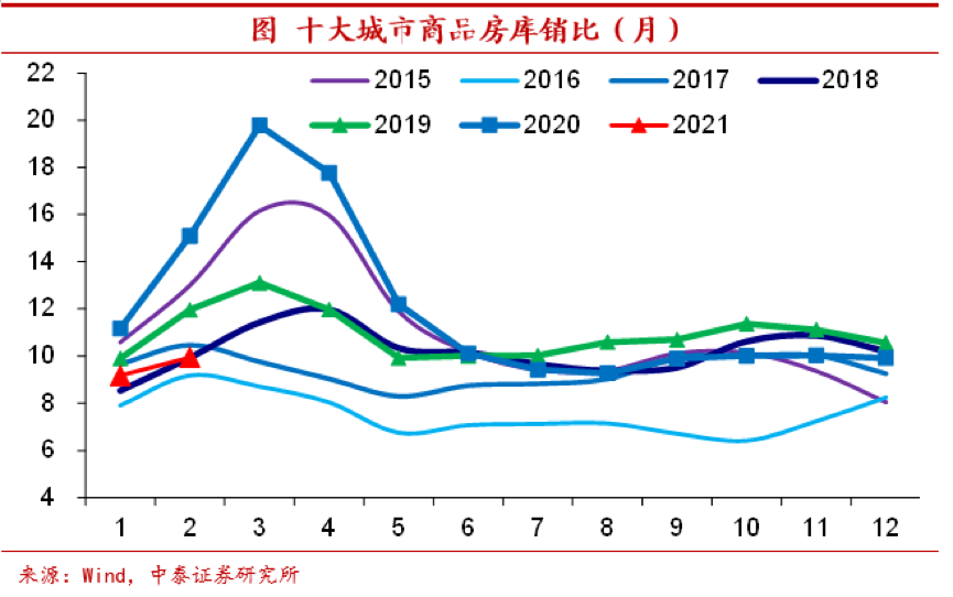 库存销售比同期新低。库存销售比(商品房待售面积/过去三个月销售面积均值)是从库存的消化速度来衡量库存的相对水平。由于商品房销售增速的加快,从库存销售比反映的情况来看,2020年下半年以来房地产库存的去化速度就处于近五年的同期新低。