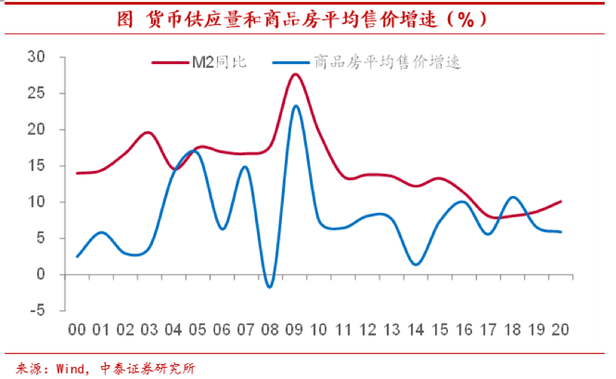 楼市再度繁荣,地产表现突出。2020年为应对疫情冲击造成的货币增速高企,带来了资产价格的大幅上涨,楼市也因此再度繁荣。2020年全国商品房的平均售价相比2019年仍高出近6%,部分核心城市涨幅尤甚。去年地产销售和投资也都表现突出,成为拉动经济快速回升的主要力量。