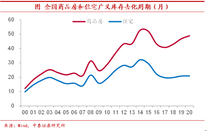 广义库销比回升,地产仍处去库阶段。而以广义库存计算的库存销售比来看。2020年底全国商品房和住宅的库存去化周期分别为48.9个月和20.9个月,较2019年底均有上升,其中商品房库存销售比回升幅度更大,反映地产行业仍有不小的去库存压力。