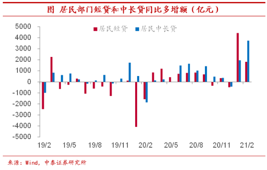 居民中长贷同比高增。但调控政策的效果目前还未充分显现。一方面,从融资端来看,今年前两个月,居民部门中长期贷款同比多增额超过5500亿元,月均多增2850亿元,远远超过2018年以来各月水平,而居民中长贷多增背后就和居民购房行为密不可分。