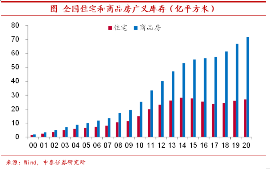 广义库存规模仍大。但事实上,仅通过待售面积指标来考察地产库存,会形成显著的低估。因为待售面积只包含了已竣工但未销售或出租的商品房面积,而没有考虑已开工未竣工的未销售期房。若以历年累计新开工面积与历年累计销售面积之差来构建更广义的地产库存指标,我们发现,2020年底全国商品房广义库存超过70亿平方米,库存增速较2019年有所走低,但仍高于2016年-2018年的增速水平。