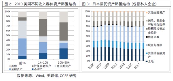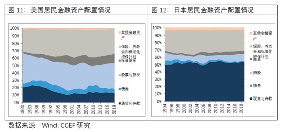 随着宏观经济发展增速放缓与人口老龄化程度的加深,整个社会的投资风险偏好将趋于下降。为养老而进行预防性储蓄与投资成为不受利率因素影响的刚性需求,最终导致资金对高风险资产(如股票和权益基金等)的配置比例下降,同时对保险、养老金、固定存款等金融产品的投资比例上升。美国和日本的居民金融资产配置比例差异佐证了这一规律。
