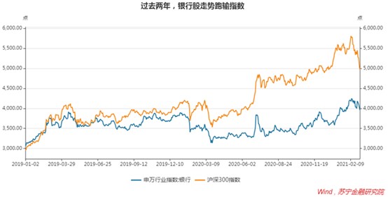 2019-2020两年间(2018.12.31-2020.12.31),申万银行业指数累计涨幅20.9%,落后沪深300指数55个百分点,“三傻”之一的名头当之无愧。