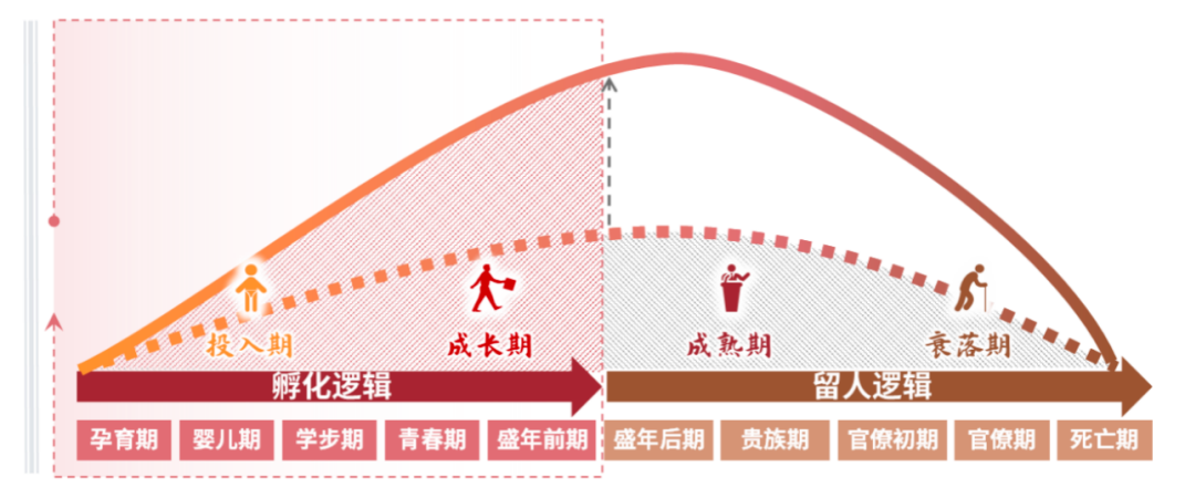那么,对待县城中的年轻人,就应该是“孵化逻辑”而不是“留人逻辑”,应该为年轻人提供能力增长的孵化环境。具体而言,如下图所示,就像企业有生命周期一样,人才发展同样也有生命周期。假设年轻人会在能力最强的时期“能级跃迁”到大城市,就尽量让成长曲线冲高,不仅符合年轻人的诉求,也会给县城带来更大的人才价值收益!