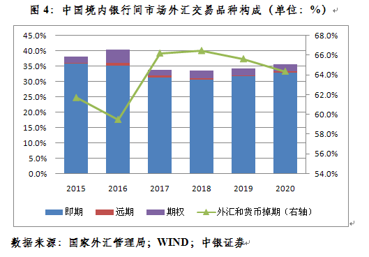 从国家外汇管理局的统计数据看,中国境内对外汇和货币掉期的运用更加活跃。去年,境内外汇市场交易中,外汇和货币掉期交易占比55.3%。其中,境内银行间市场中,外汇和货币掉期交易占比更是高达64.4%。值得一提的是,掉期交易在银行间市场占比较高并非去年人民币升值后才发生的,2015至2019年平均占比为63.9%,去年占比较上年还回落了1.3个百分点(见图4)。