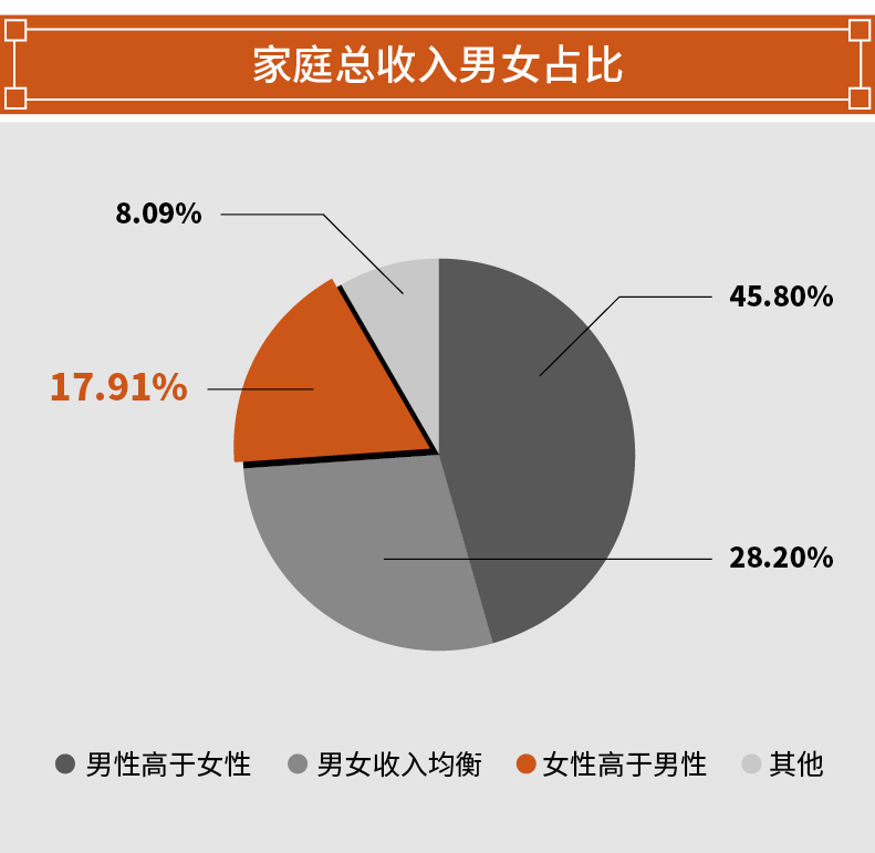 调查问卷显示:在家庭总收入构成中,虽然45.8%的家庭依旧是男性收入高于女性,但同时,女性收入高于男性或等于男性的比例已达到了46.11%。