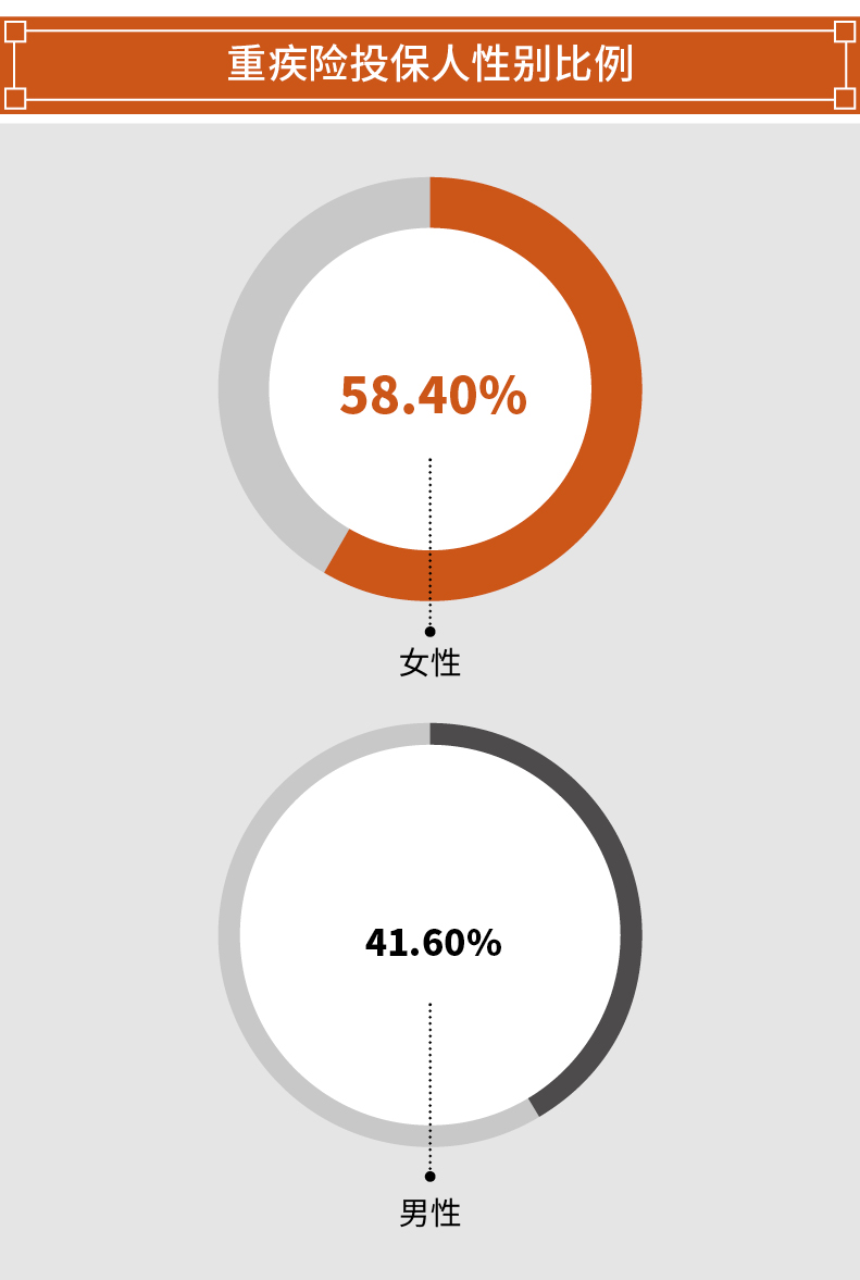 作为家庭的主要维护人,女性更是担心家人一旦患病后的各项支出会成为整个家庭的不可承受之重,所以,在重疾险的投保人群中,女性占比达到了58.4%。
