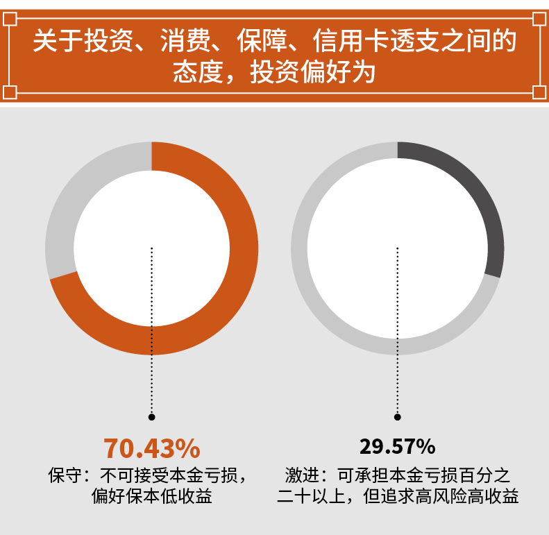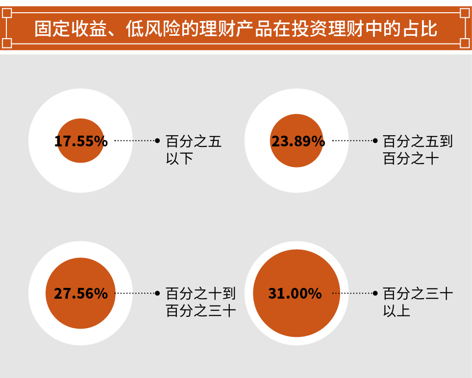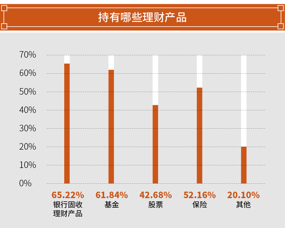 调查问卷显示:在家庭的金融资产池子中,超过五成的家庭配置了“金融三宝”:银行理财、基金和保险。31%的家庭中,固定收益、低风险的理财产品占比超过30%。