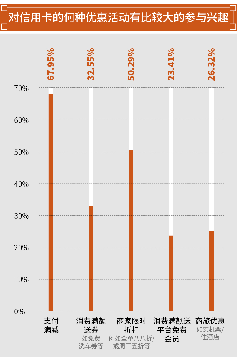 调查问卷显示:女性在信用卡消费方面,可谓极致。受访的女性群体对信用卡优惠活动中最感兴趣的是支付满减,其次是商家限时折扣,两种均是简单高效的省钱策略。