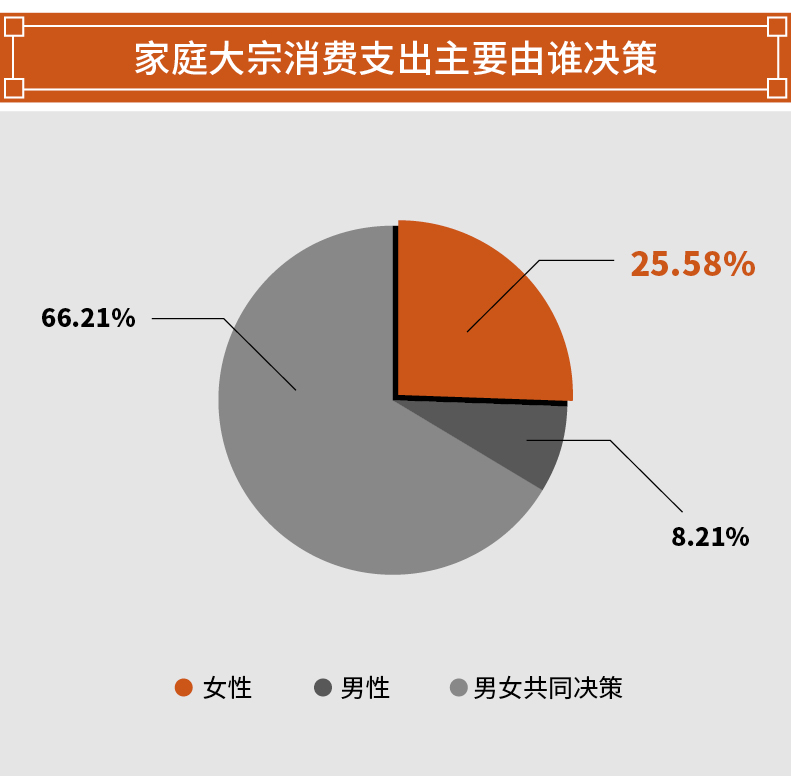 调查问卷显示:对于家庭大宗消费支出决策,要么女性主导,要么夫妻共同主导;在家庭各成员的日常消费支出占比中,孩子是重头,其次是女性,消费占比达到40.74%,而男性只有11%。