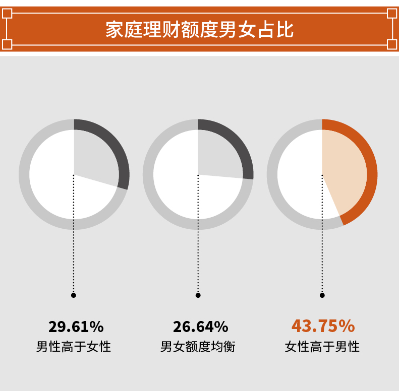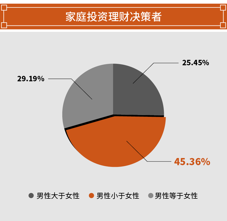 调查问卷显示:45.36%的家庭中,女性是投资理财的决策者,而仅有25.45%的家庭中,男性是投资理财决策者。另外,43.75%的家庭中,女性的理财额度要高于男性,仅有29.61%的家庭男性理财额度高于女性。
