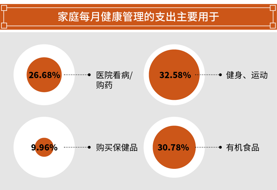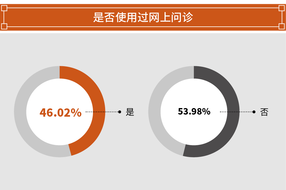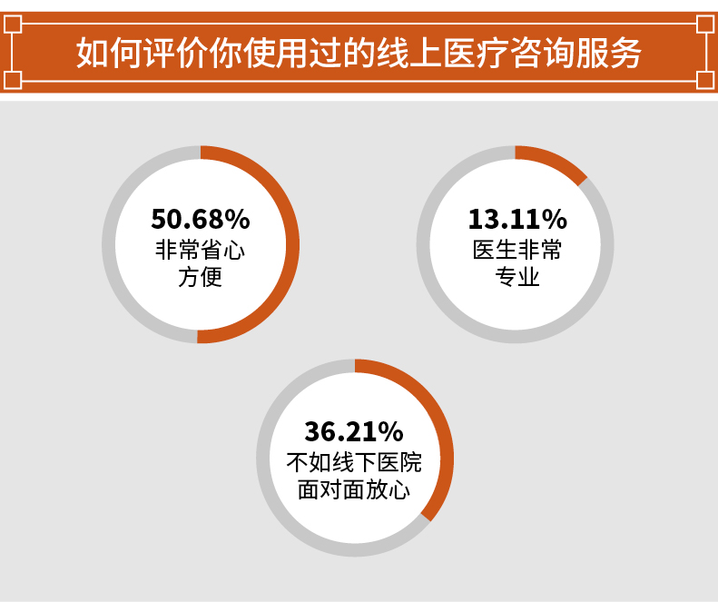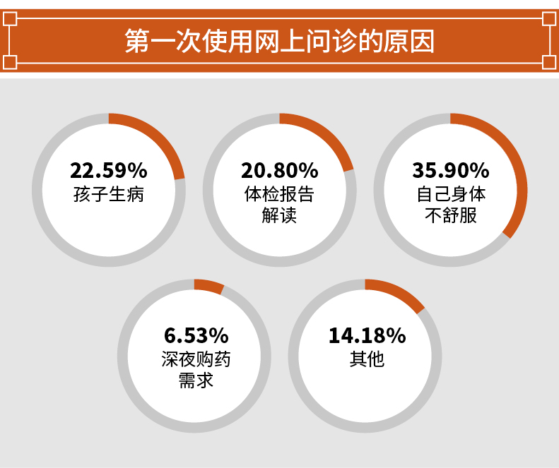 调查问卷显示:家庭每月健康管理的支出主要用于健身、运动,占比达到32.58%;46.02%的受访人已经使用过网上问诊,且首次网上问诊的主要原因依旧是自己或孩子的健康问题,两项占比接近60%;50.68%的受访人认为,线上医疗非常省心方便。