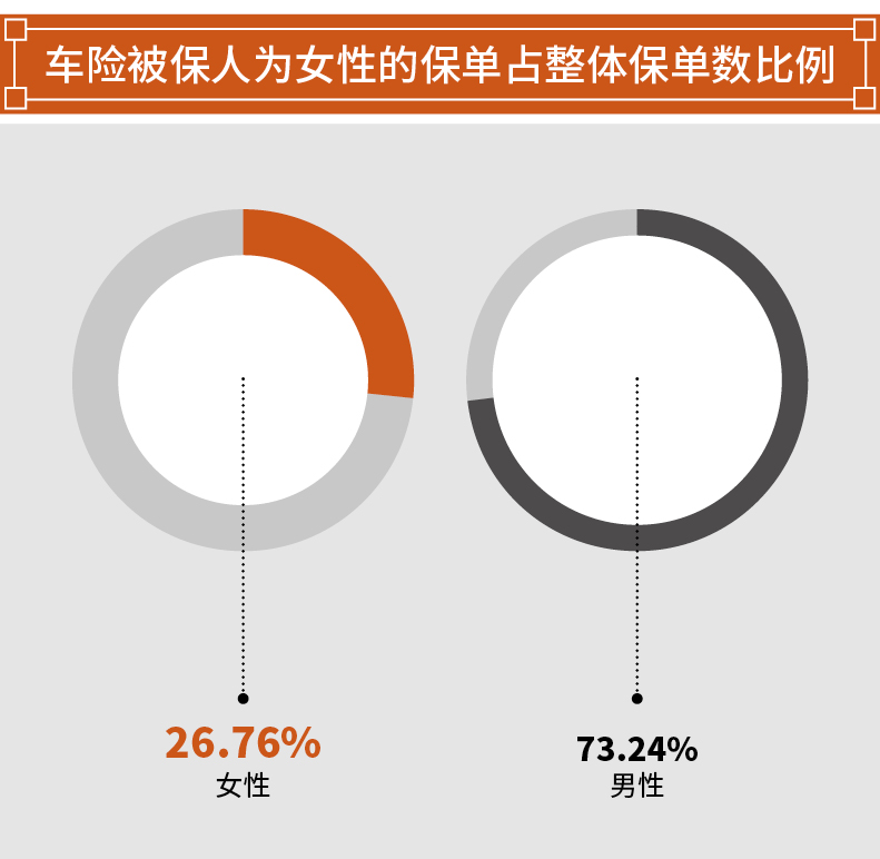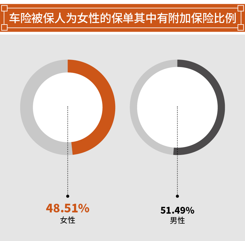 车险,也是家庭保险消费的硬支出,虽然,车险被保人为女性的保单占整体保单数比例为26.76%,远少于男性,但车险被保人为女性的保单中有附加保险的比例却达到了49%,与男性相当;女车主的人均三者保额达到102万,而男车主的人均三者保额为100万。
