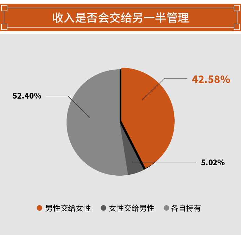随着女性收入的与日俱增,两性话语权也逐渐步入了平等状态,尤其是在家庭财务持有上,更倾向于“你管你的钱、我管我的钱”。所以,超过一半的家庭中,男性、女性的收入是各自持有的,另外,42.58%的家庭依旧遵循着女性管钱的固有策略,而仅有5.02%的家庭是男性管钱。