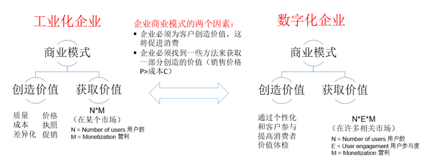 以前企业用产品思维创造价值,重点是通过标准化和规模效应打造质量、价格和销售能力上的竞争优势,获取价值基本都遵循用户数乘以单位产品盈利的公式(价值=NM,见上图)。今天,创造价值的方式发生了变化,产品质量和价格依旧很重要,但是只有质量和价格是不够的,要通过个性化和客户参与提高消费者的价值体验,获取价值的公式还要考虑到用户参与度(价值=NEM,见上图)。