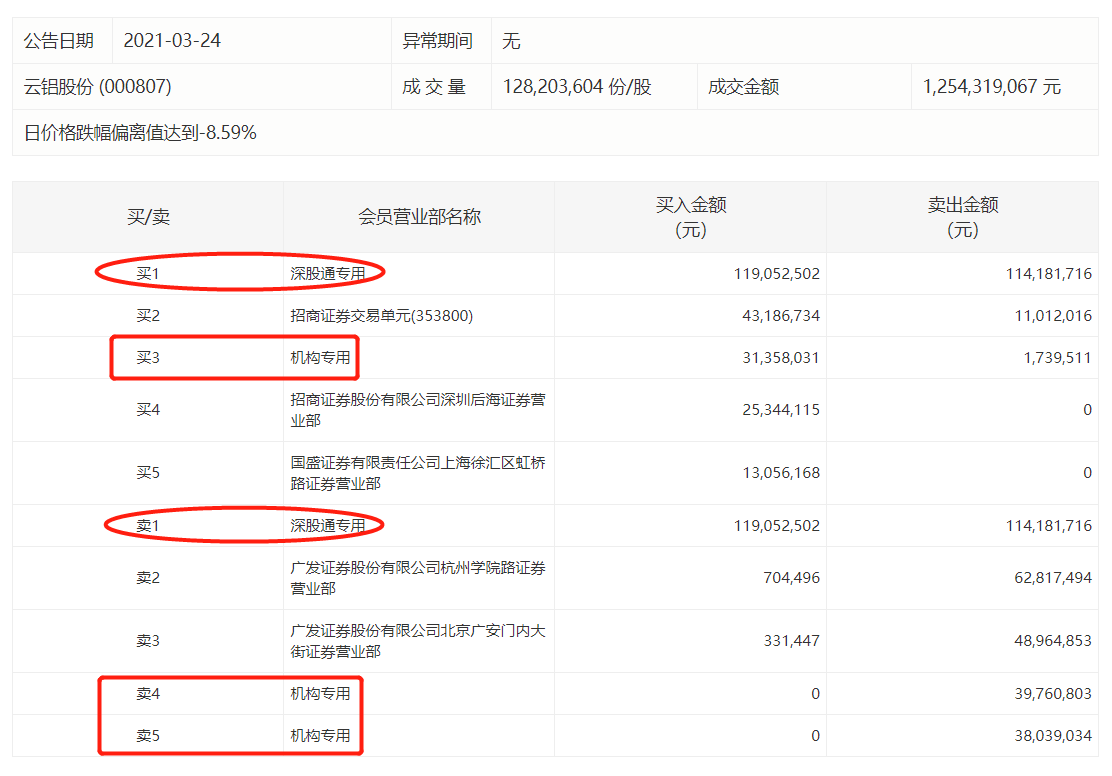 3月24日,云铝股份再度跌停,收报9.66元,换手率4.56%,振幅4.57%,成交额12.54亿元。盘后数据显示,深股通买入1.19亿元并卖出1.14亿元,一机构买入3136万元,两机构合计卖出7780万元。